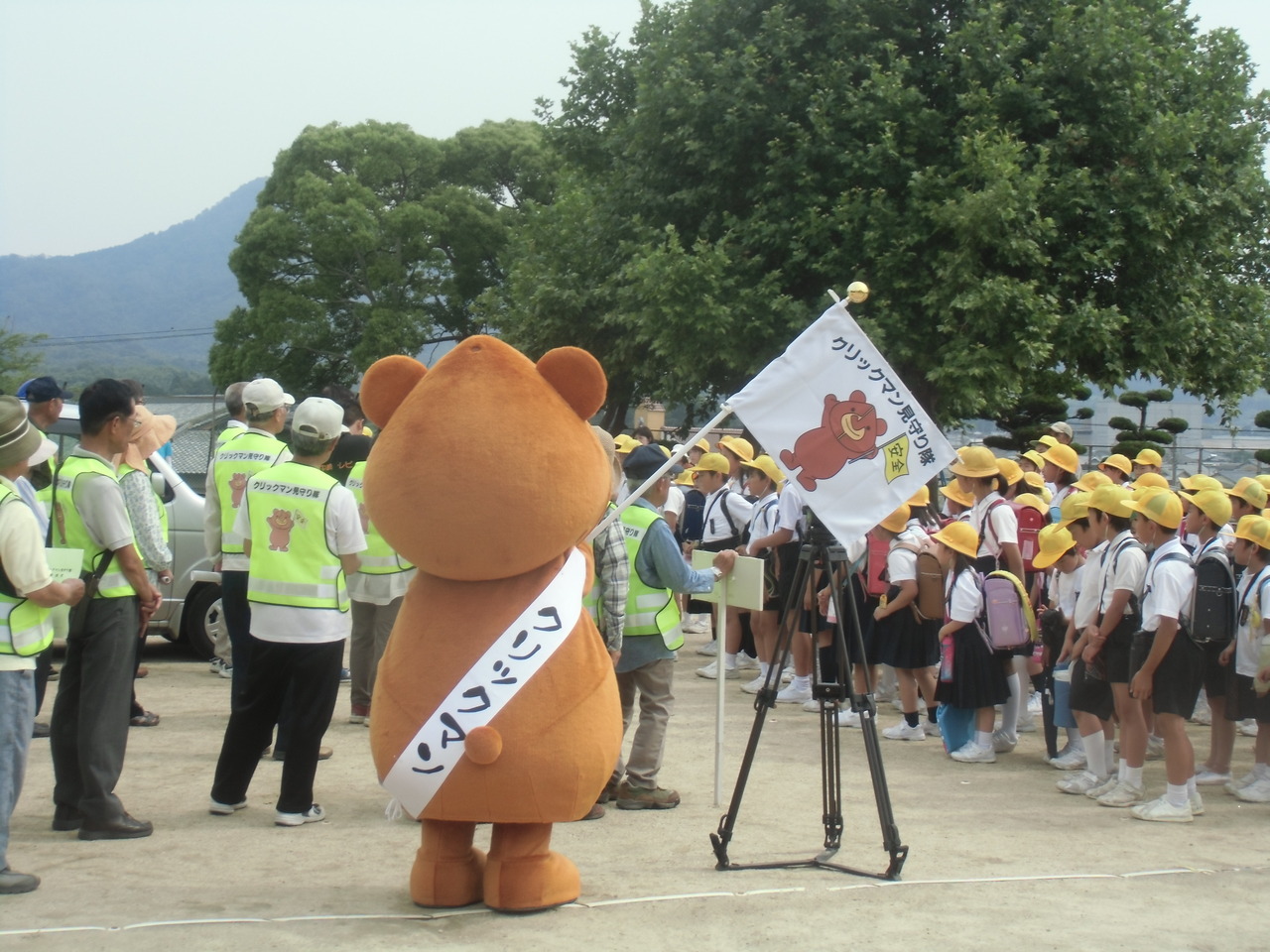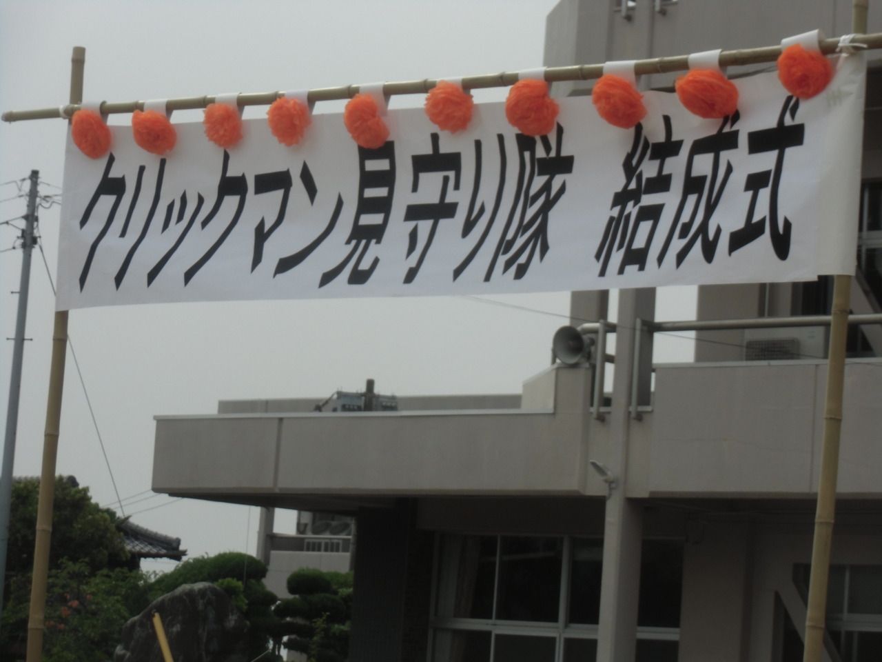 本日このクリックマンにちなみ地元小学生の登下校を見守る地域のパトロールチームが結成されその式典が先程ありました。副市長や議長、警察署長等堂々たる顔ぶれの来賓が見守る中小学校児童とともに行われました。パトカーや白バイに加えて地区の青パトまでいました。聞くところによるとこの青パトの軽自動車は地元自動車会社の会長さんが地区のためにと寄付して下さったみたいです。田舎ならではの強い郷土愛を感じます。