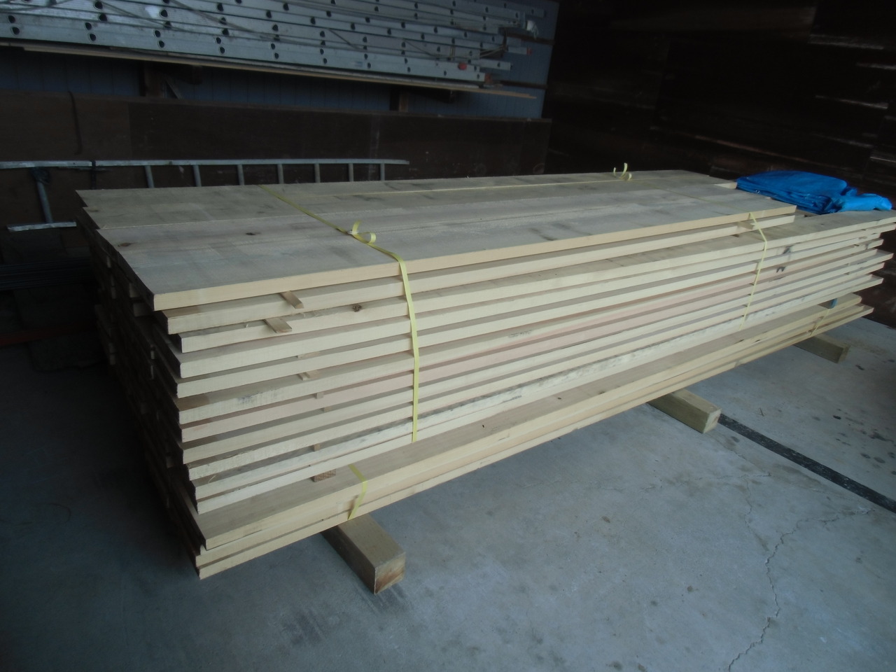 天然の木曽桧の厚板です。200年生のとても貴重な材料です。小生は杉の愛好家ですが、この天然檜(天桧)は大好きです。故人である創業者は大工の棟梁であったため桧は大好きでした。米栂が主流の造作材の全盛期にも桧を在庫して乾燥させ桧普請にこだわりをもっていました。そして木柄の古い年数を喰った木が大好きで、木の生を大切にし材料の加工は絶対に大工にしかさせませんでした。木には加工する方向や曲がり具合、木と理解しあえる修行を積んだ職人(匠)のみが許される境地でした。今は時代も変わり弊社でも大工以外が加工もします。果たしてそれは良い事なのか?自問自答する毎日です。