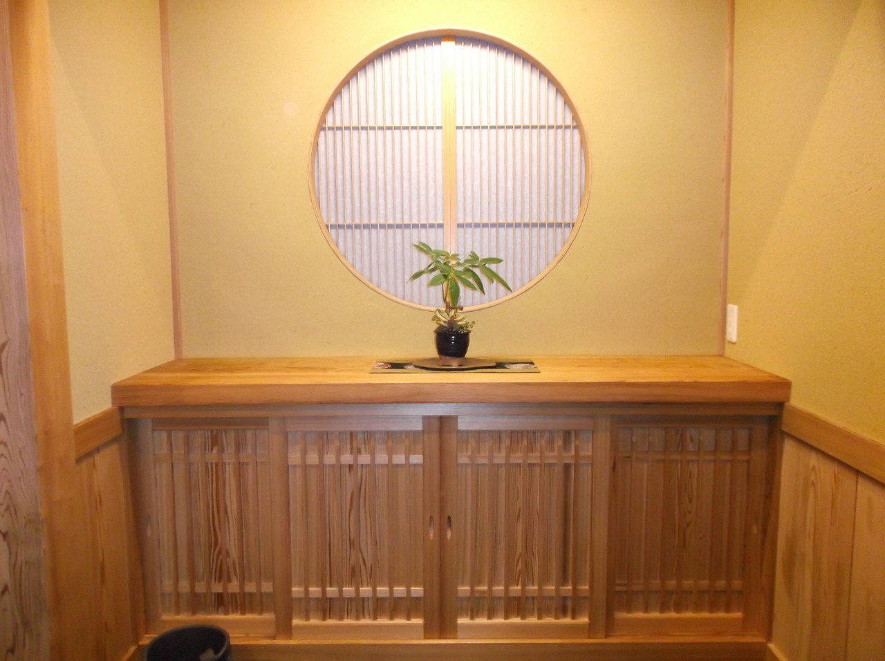杉の天板から建具以外のすべての仕事が自社大工施工によるものです。設計は不肖小生が行いました。もちろん材料も自社材庫品です。落ち着いた雰囲気でしょう?