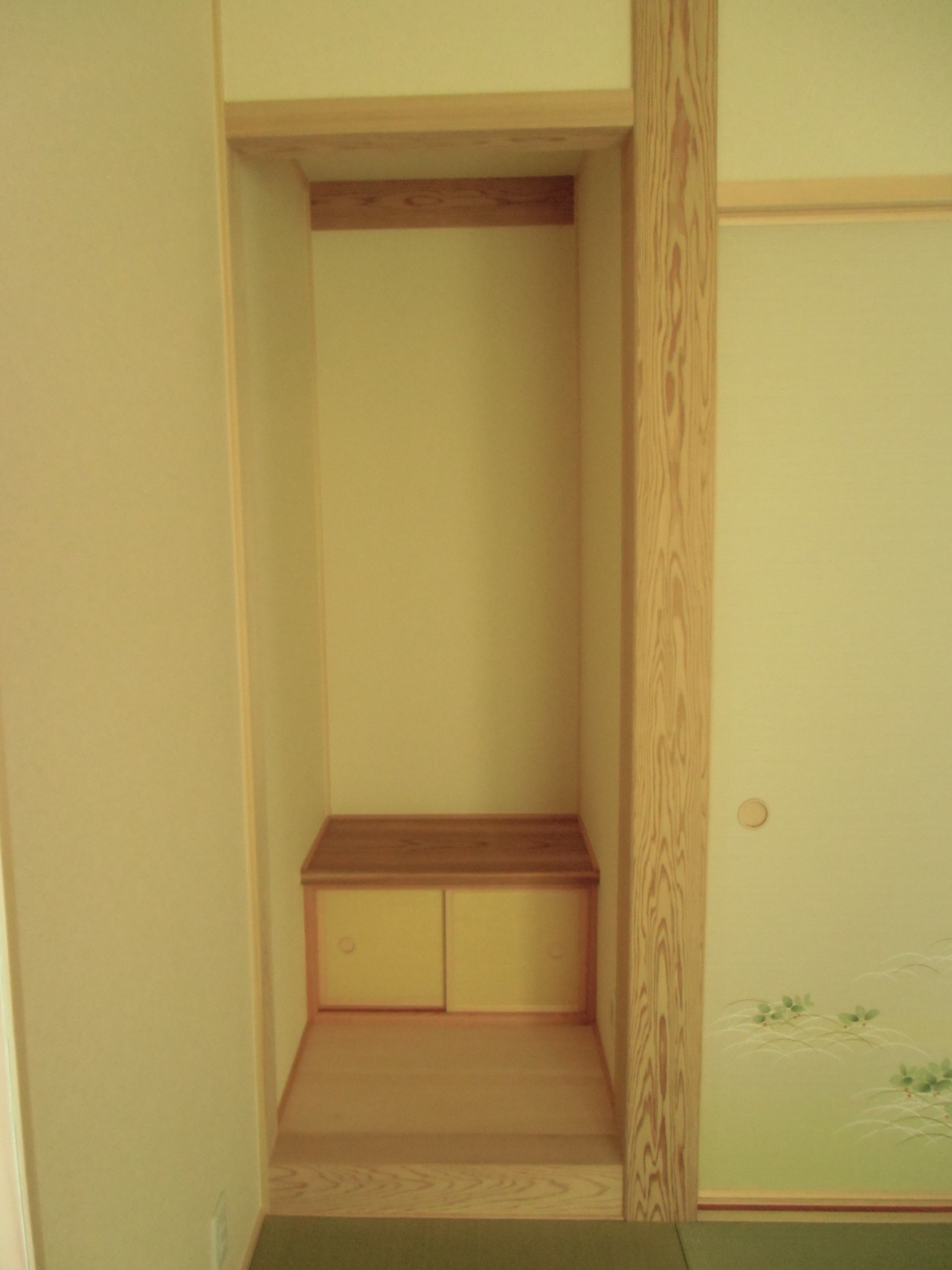 半間床コとは言え手加減しません。床柱、床框 床コ天板、落とし掛け、雲板は天然杉、前板は無垢桧の無地物です。素朴な中にも味わいがあります。