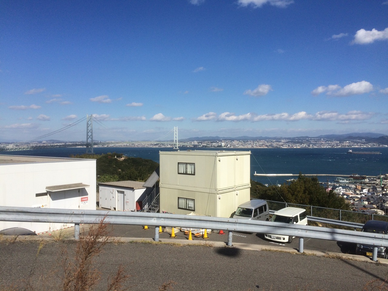 晴天の中、本州を見渡すこの景色を現場仮設事務所を中心に撮影するおつな心の持ち主。それが、つだにくんです。