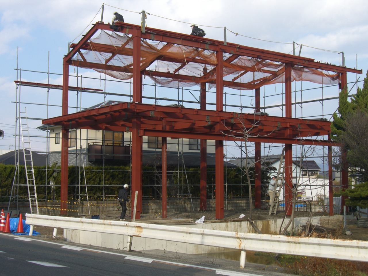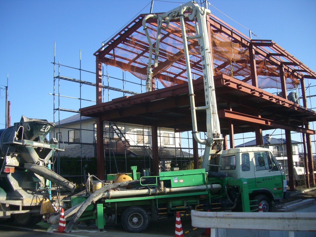 2Fスラブコンクリート打設S造2F建:1F作業所+事務所兼2F住宅」の上棟です